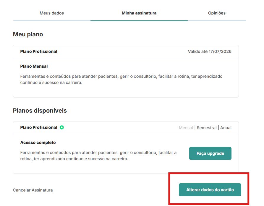Como alterar o cartão cadastrado para pagamento? Para alterar o cartão vinculado a sua assinatura clique na sua foto na parte superior direita do DIetbox > meu perfil > minha conta > minha assinatura > alterar dados do cartão