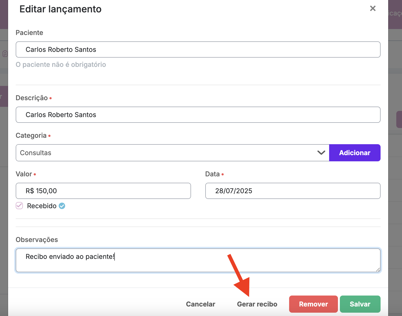 Depois de salvar a entrada, você consegue voltar para marcar como recebido e gerar o recibo. Você pode inclusive escrever nas observações se enviou o recibo ao paciente:
