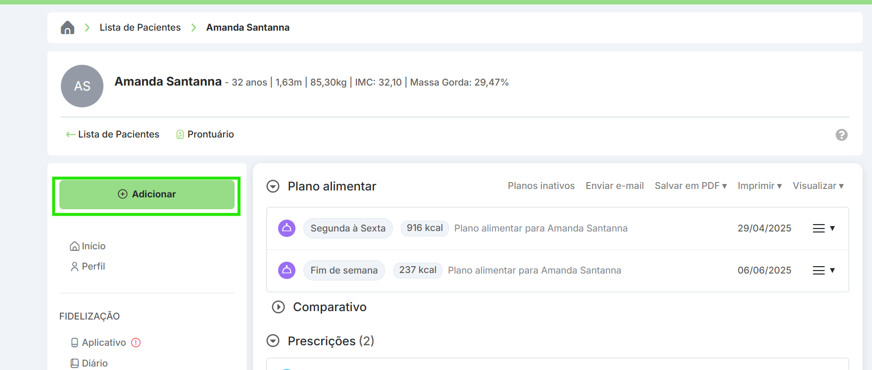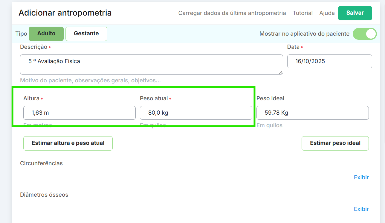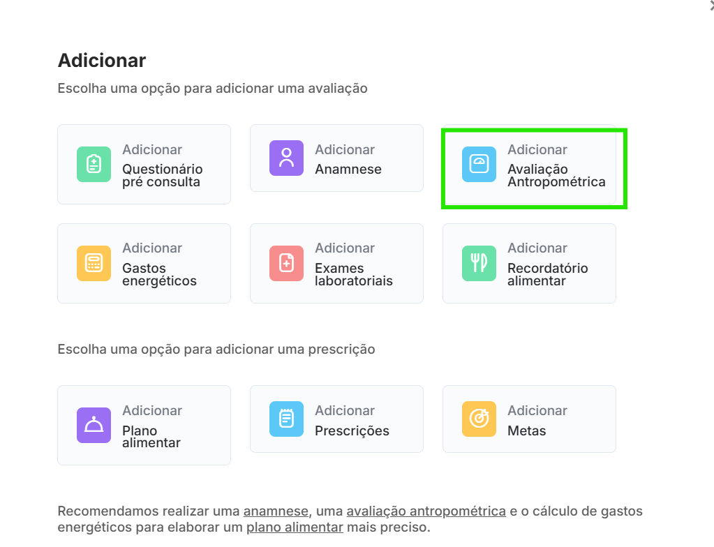 Na tela do paciente, você irá em adicionar > avaliação antropométrica