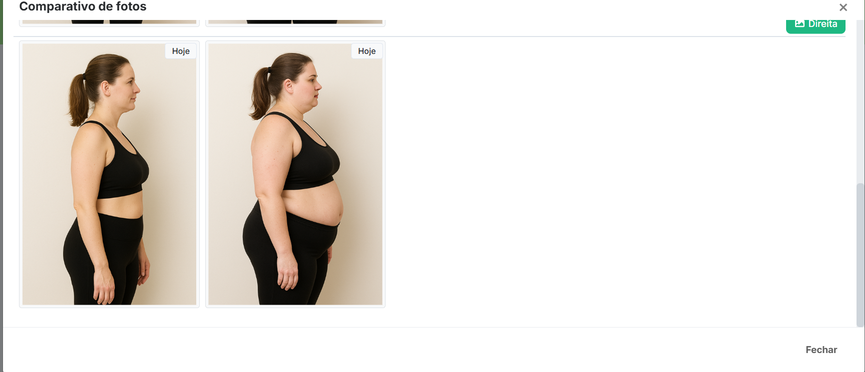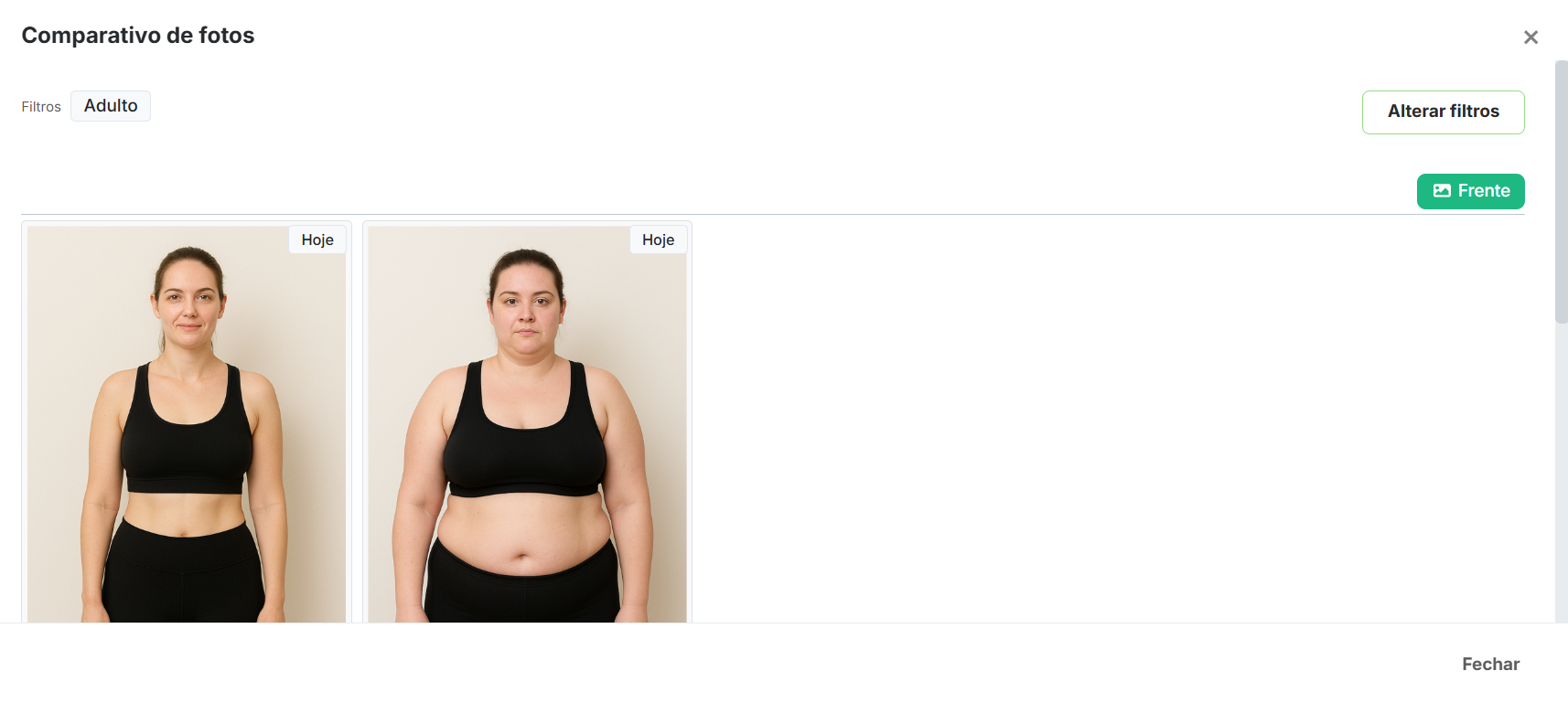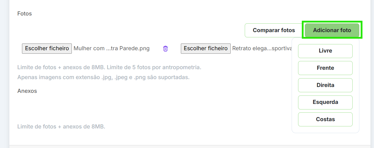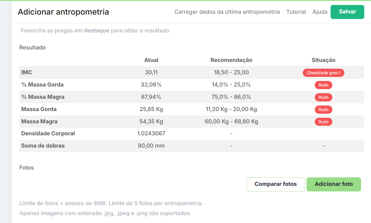 Você pode fazer um comparativo da evolução antropométrica através de foto. Você pode incluir até 5 fotos por avaliação.
