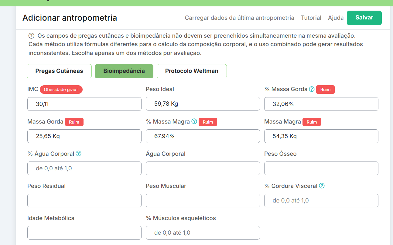 Bioimpedância: se você utiliza balança de bioimpedância em seus atencimentos, você poderá preencher os dados que sua bioimpedância fornece. O preenchimento de todos os campos não é obrigatório. Caso sua biompedância não forneça algum dado, poderá deixar o campo em branco.