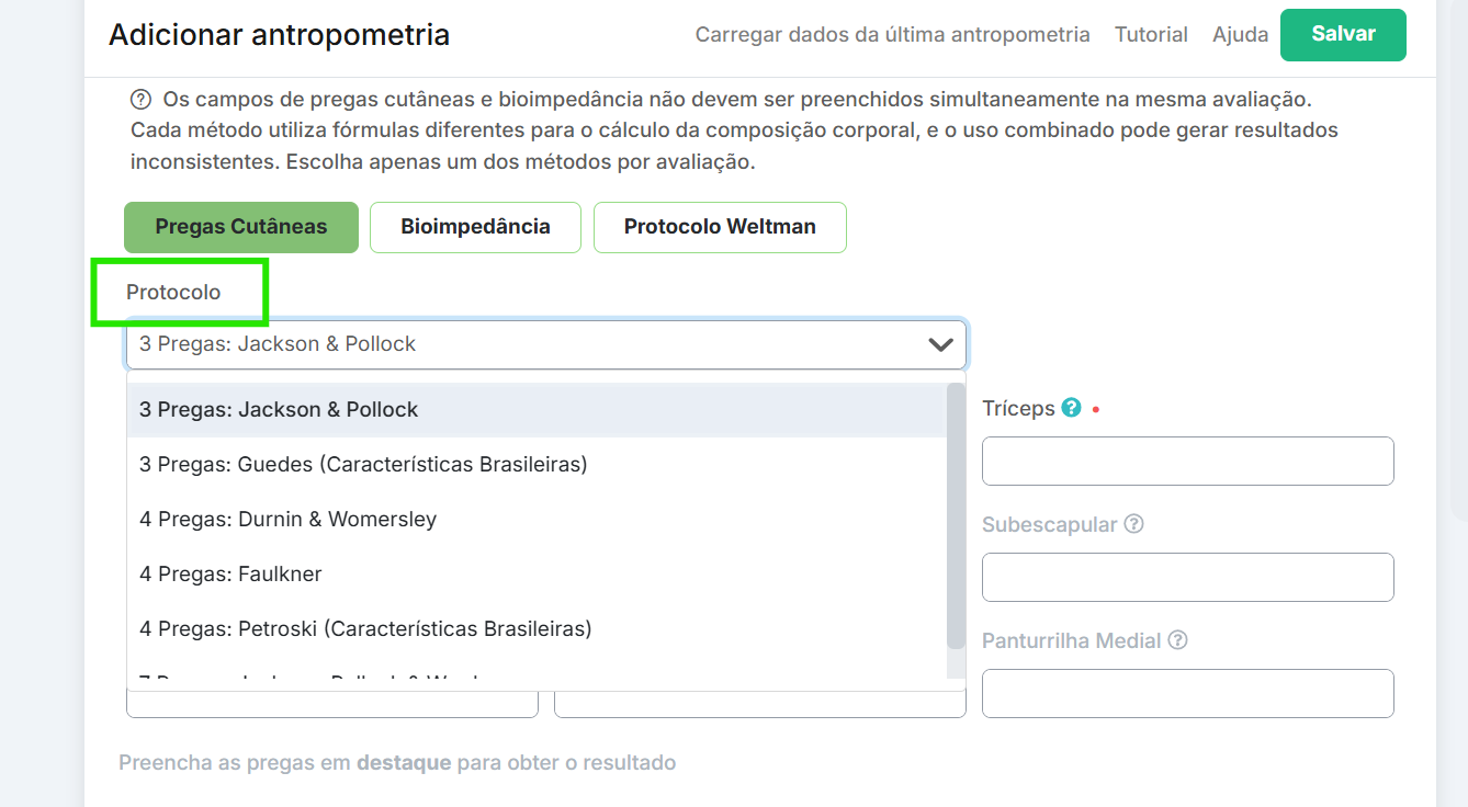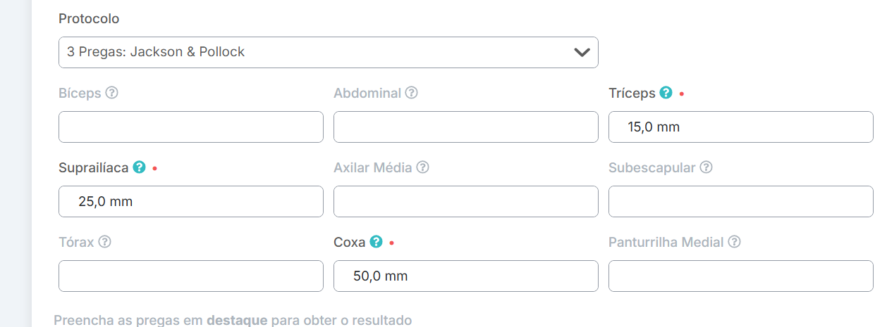 Pregas cutâneas: você irá selecionar o protocolo desejado e irá preencher as dobras obrigatórias do protocolo (dobras em negrito). A partir dos dobras preenchidas, o sistema irá calcular o % de gordura.