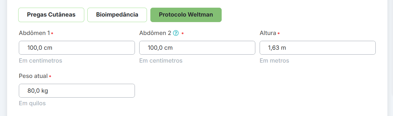 Protocolo de Weltman: protocolo indicado para pacientes com obesidade. Para utilizar este protocolo, você deverá preencher duas vezes a circunferência da cintura e, caso não tenha preenchido anteriormente, a altura (metros) e peso (kg). A partir destes dados, o sistema irá calcular o % de gordura e % de massa magra.
