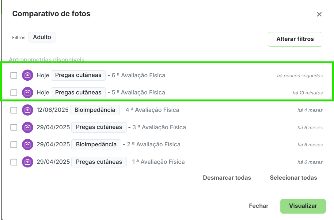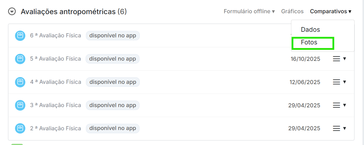 Para realizar comparativo por fotos você precisa ter duas avaliações adicionadas, após esse registro você clica cm comparativos> fotos> seleciona as avaliações