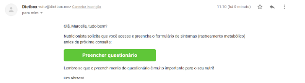 Quando o nutricionista solicitar o rastreamento metabólico através da anamnese, o paciente receberá este e-mail: