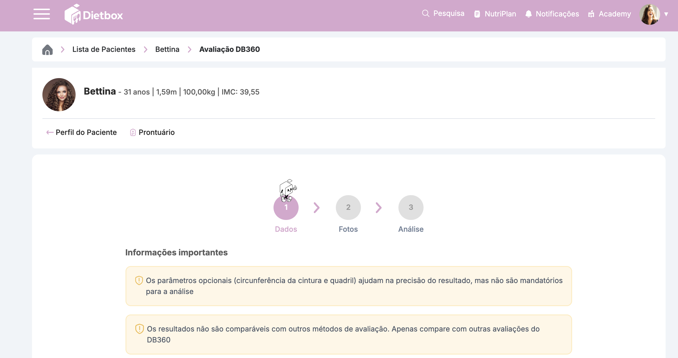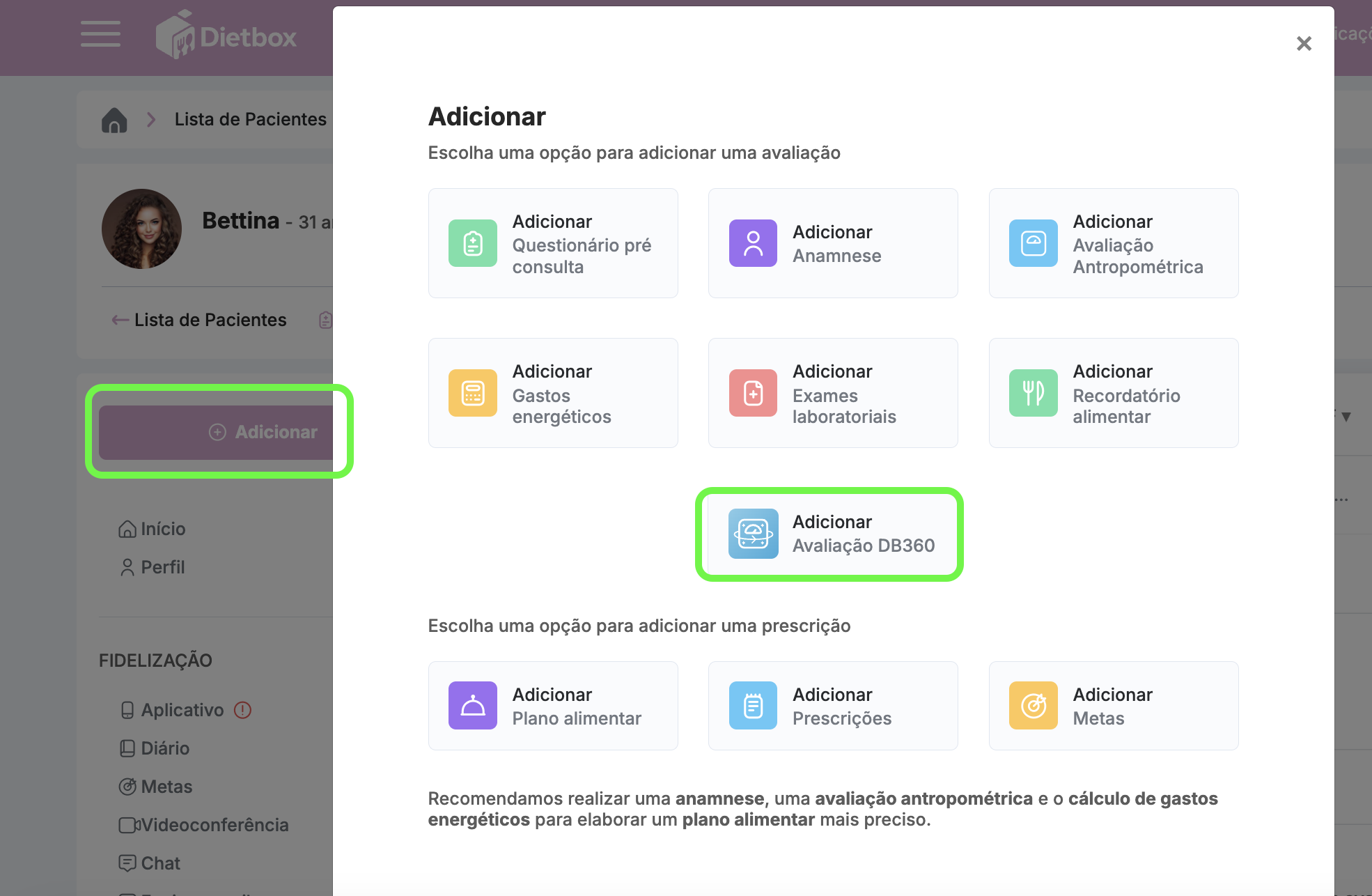 Como utilizar o DB 360? Acesse a Tela do Paciente que você deseja avaliar > Adicionar > Adicionar Avaliação DB360 Siga as instruções e aproveite a ferramenta! Criamos manuais para o paciente e para o Nutri ensinando a tirar as fotos e avaliar os resultados, e você pode fazer download clicando aqui!